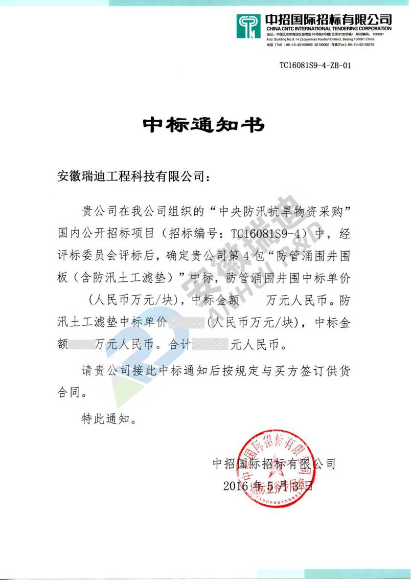 我公司憑借過硬的產(chǎn)品品質(zhì)、完善的技術(shù)方案及合理的產(chǎn)品報價在競爭對手中脫穎而出,順利中標(biāo)中央防汛抗旱物資采購項目(招標(biāo)編號:TC16081S9-4)第四包“防管涌圍井圍板(含防汛土工濾墊)”中標(biāo)。