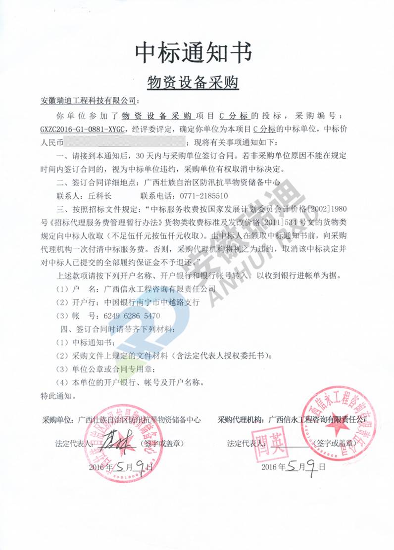 我公司憑借過硬的產(chǎn)品品質(zhì)、完善的技術方案及合理的產(chǎn)品報價在競爭對手中脫穎而出,順利中標廣西壯族自治區(qū)防汛抗旱物資儲備中心(簡稱“招標人”或“甲方”)物資采購項目(采購編號:GXZC2016-G1-0881-XYGC)C分標。