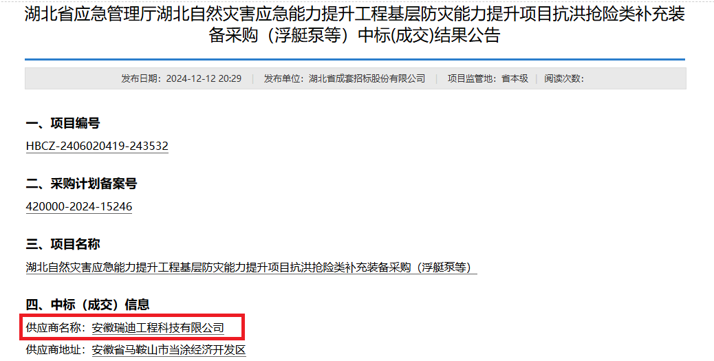 熱烈祝賀我司在湖北省應(yīng)急管理廳湖北自然災(zāi)害應(yīng)急能力提升工程基層防災(zāi)能力提升項(xiàng)目抗洪搶險(xiǎn)類補(bǔ)充裝備采購(浮艇泵等)招標(biāo)中脫穎而出,成功中標(biāo)!中標(biāo)金額為 4896.227萬元,這是公司發(fā)展歷程中的又一重要里程碑!