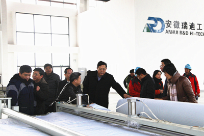 2014年12月11日下午,南京水科院院長張建云、副院長孫金華、總工程師竇希萍、總會(huì)計(jì)師薛亞云等一行來到當(dāng)涂試驗(yàn)基地視察基地建設(shè)和試驗(yàn)生產(chǎn)項(xiàng)目進(jìn)展情況。在總公司投資建設(shè)的安徽瑞迪工程科技有限公司土工席墊試驗(yàn)廳,安徽瑞迪公司總經(jīng)理鄢俊向張?jiān)洪L一行詳細(xì)介紹了生產(chǎn)設(shè)備、原材料、生產(chǎn)工藝和流程、產(chǎn)品銷售、市場開拓以及公司的運(yùn)行管理等情況。