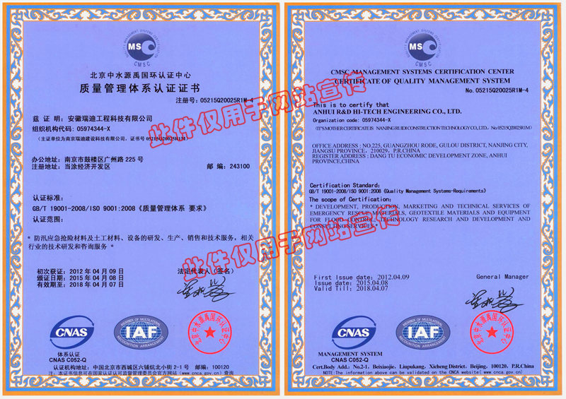 在瑞迪科技總公司的統(tǒng)一組織下,安徽瑞迪工程科技有限公司于2015年3月31日接受了北京中水源禹國環(huán)認(rèn)證中心專家的外部審查,并于近日順利取得質(zhì)量管理體系認(rèn)證證書;這為公司進(jìn)一步的規(guī)范管理和市場開拓等提供了有力的支撐。