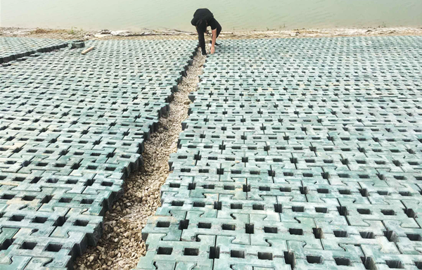 該工程設計防洪標準為100年一遇,防汛堤工程級別為一級。防汛堤采用路堤結(jié)合、生態(tài)堤岸設計,設計堤頂高程7.00m,堤頂寬度8.0m,堤頂路面兼作消防通道,采用10cm厚瀝青砼路面,泛水坡2%。工程防汛堤臨湖側(cè)邊坡采用“生態(tài)固化石技術(shù)"制成的聯(lián)鎖式護坡砌塊護面,厚度0.10m,下設0.10m厚砂石墊層及300g/m2土工布。